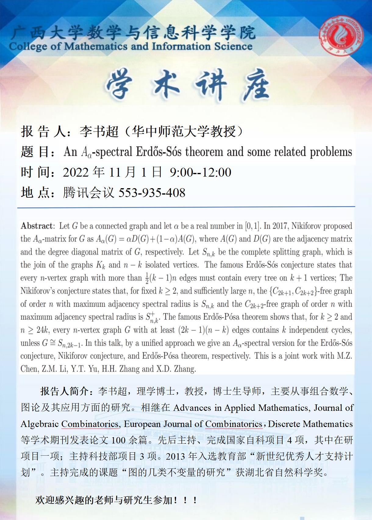 学术报告:An A.-spectral Erdos-Sos theorem and some related problems