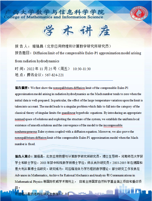 学术讲座:Diffusion limit of the compressible Euler-P1 approximation model arising from radiation hydrodynamics