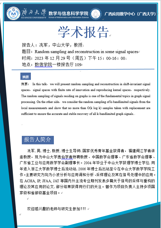 学术报告:Random sampling and reconstruction in some signal spaces
