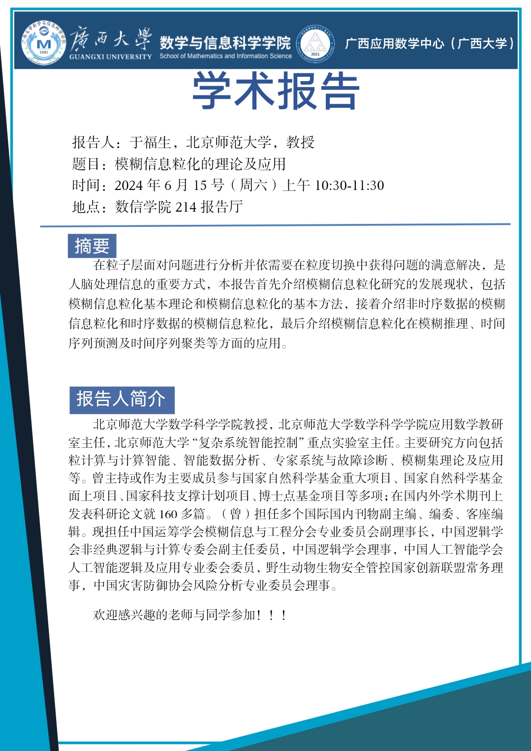 学术报告:模糊信息粒化的理论及应用