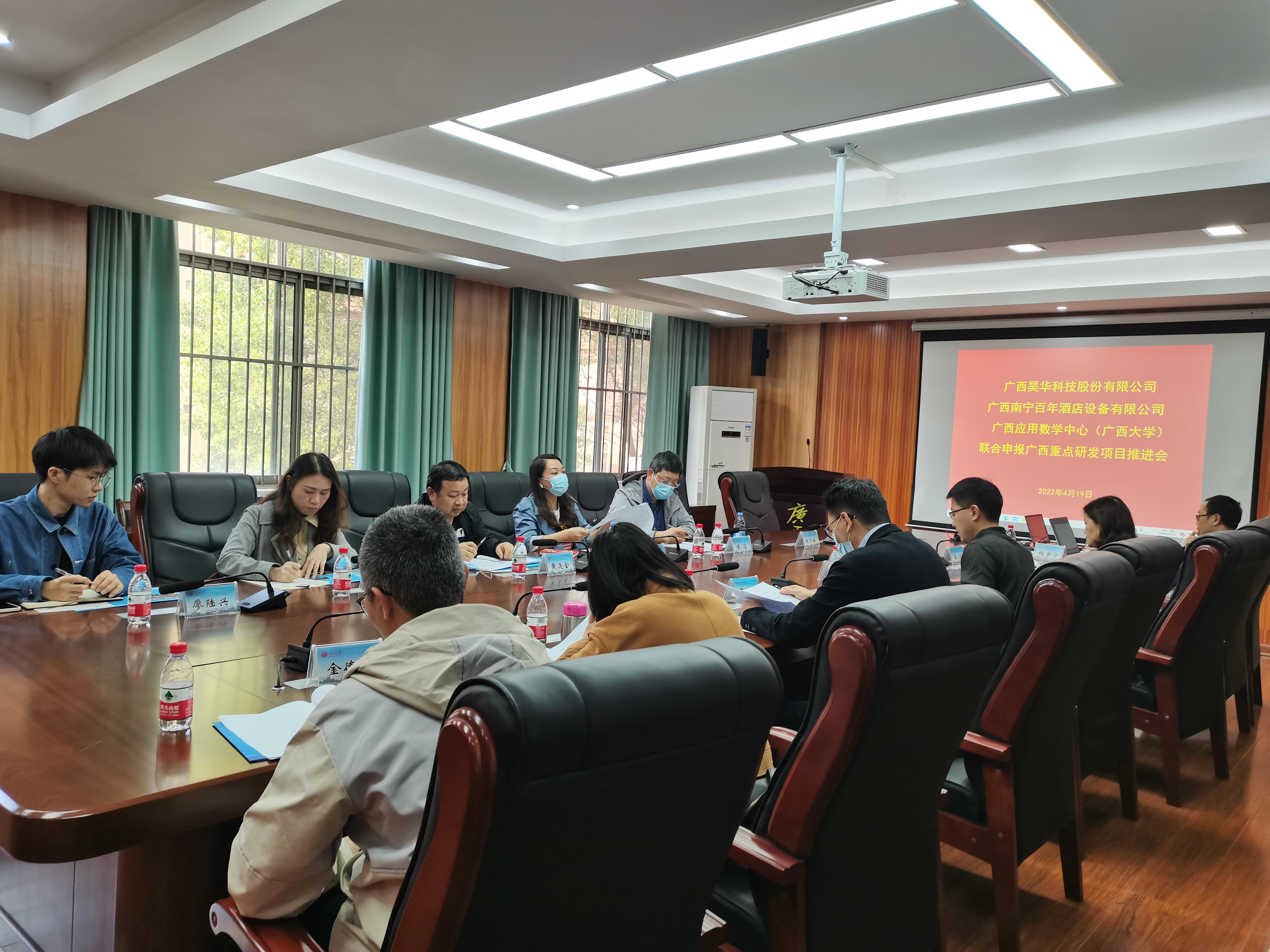 召开联合申报广西重点研发项目推进会。广西南宁百年酒店设备有限公司总经理黄连金、副总经理侯洁,广西优耐信息技术有限公司项目申报部经理梁晶,广西应用数学中心(爱情岛