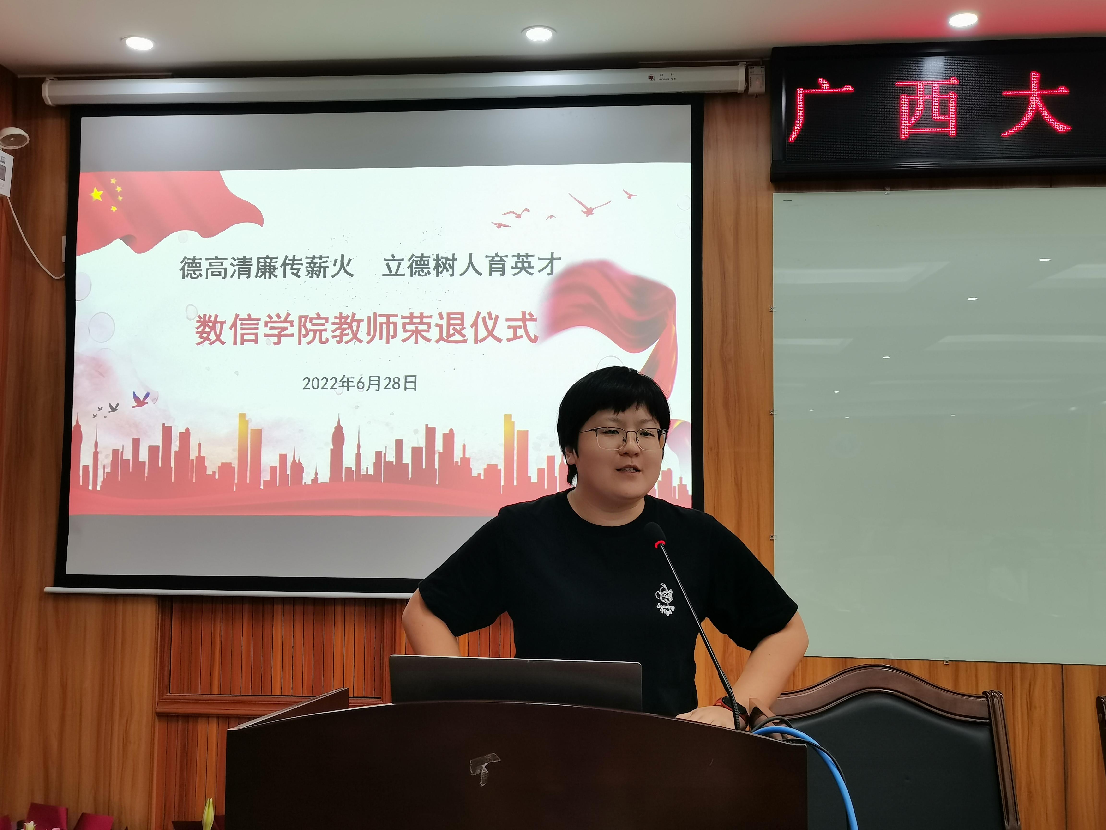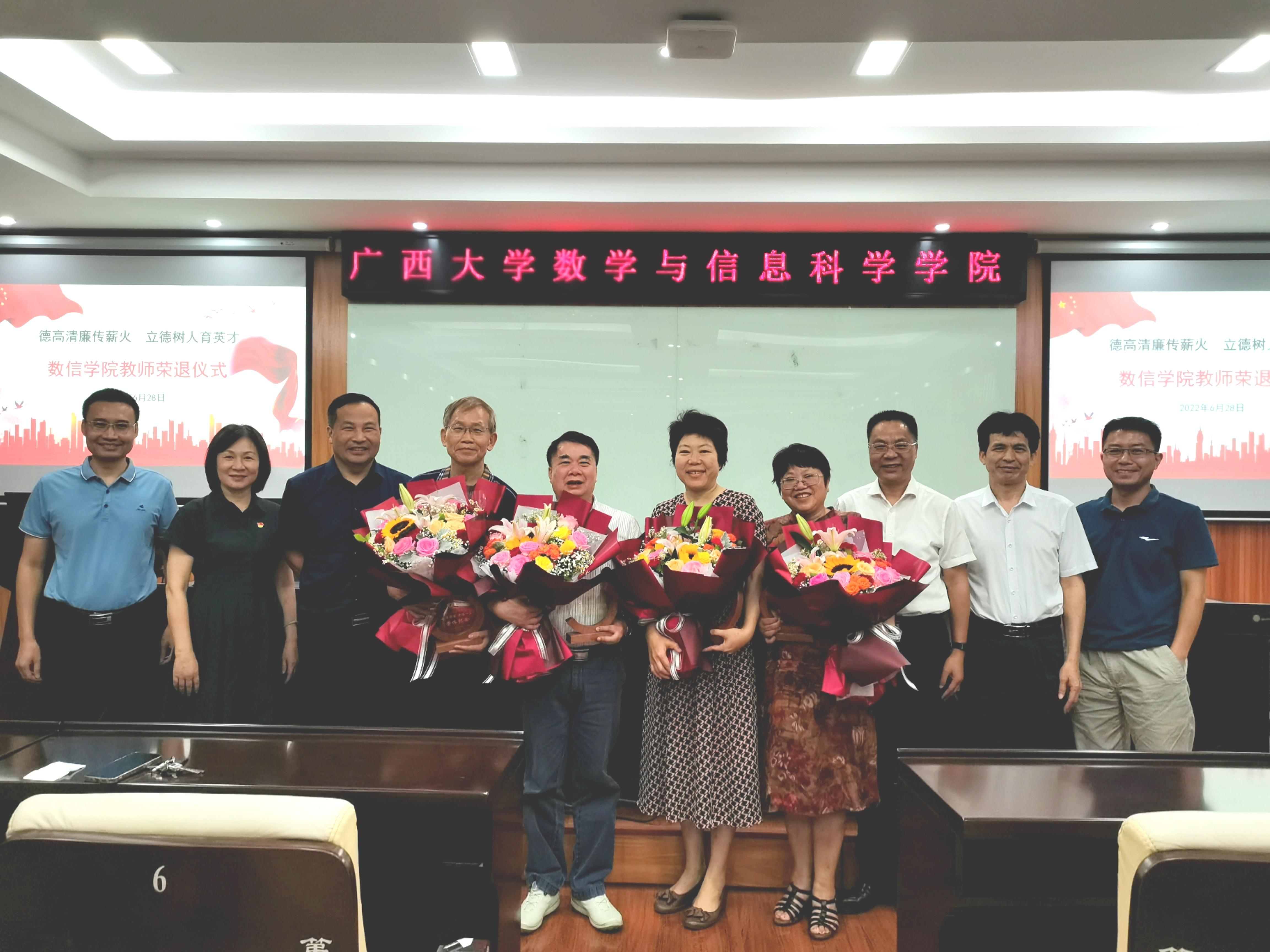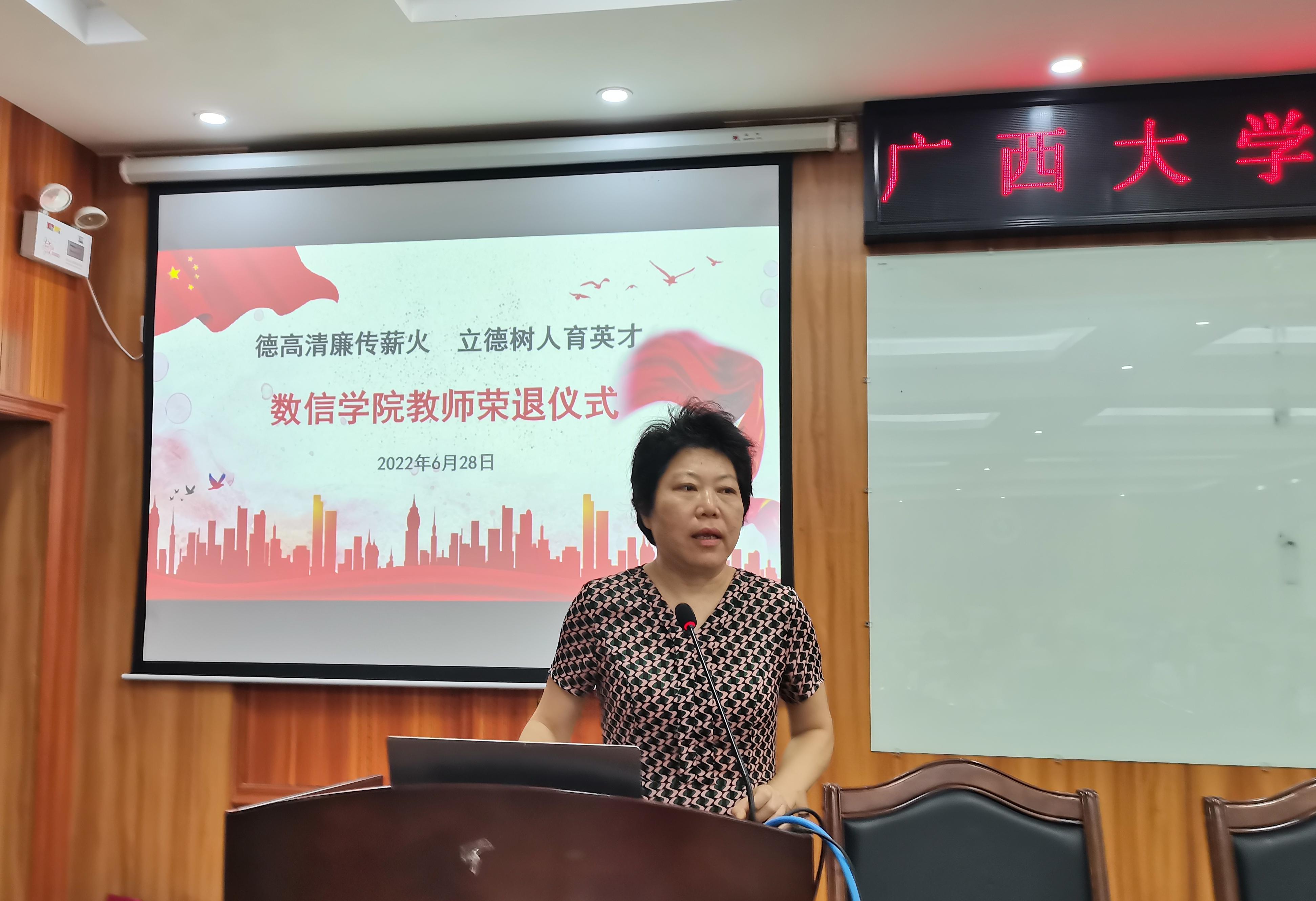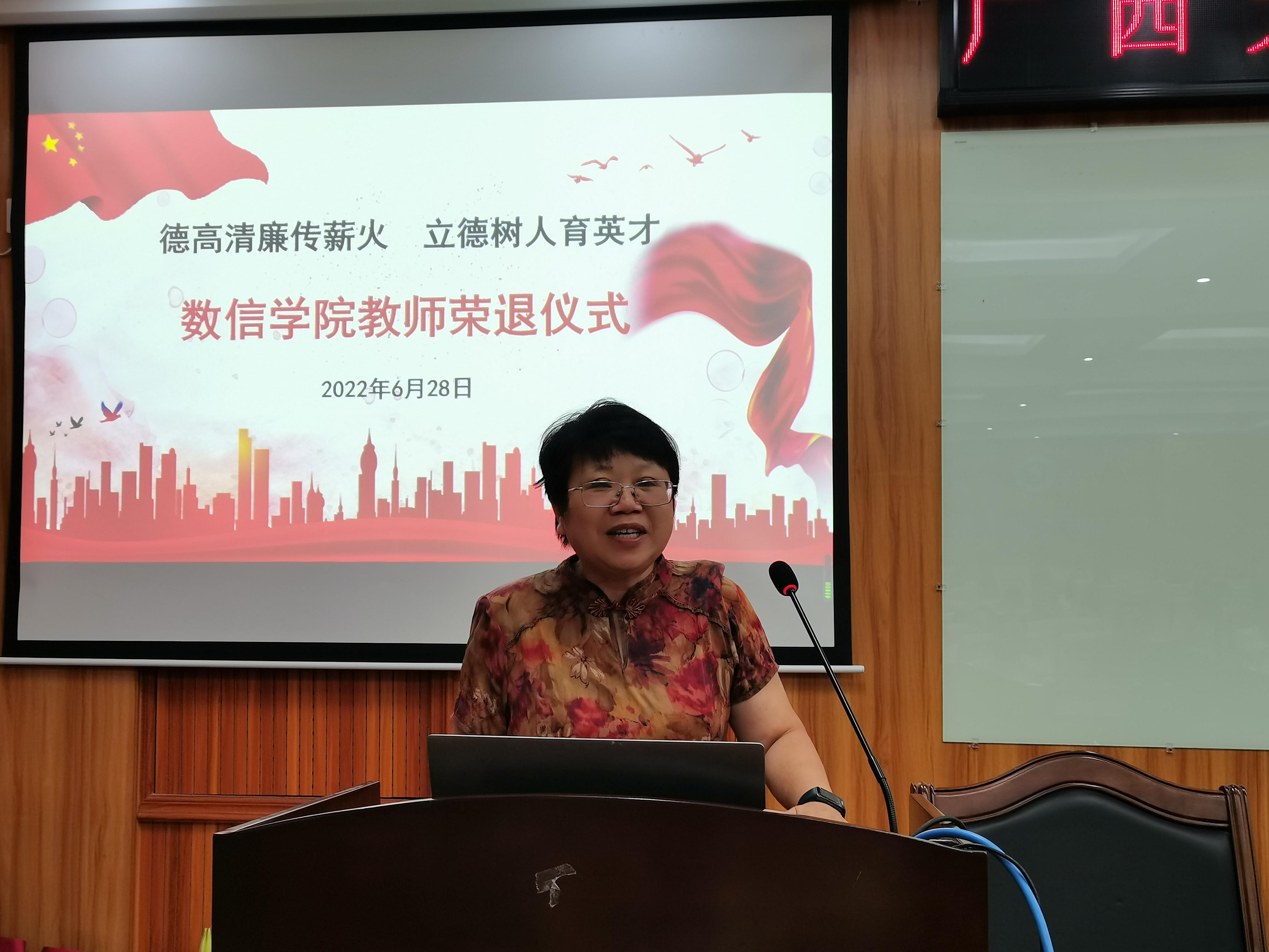 为余新华、严邦宁、韦增欣、吴如雪和梁革英5位退休教师举行了以“德高清廉传薪火,立德树人育英才”为主题的教师荣退仪式。仪式由院工会主席唐春明主持,爱情岛