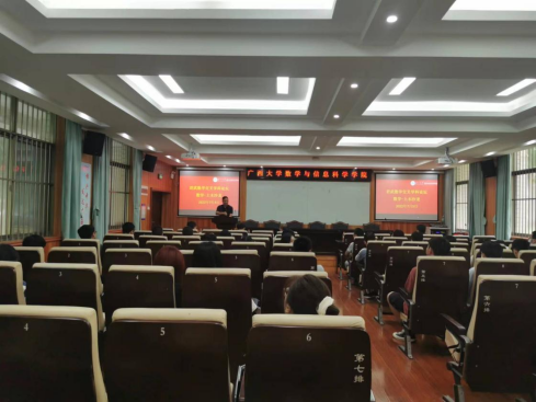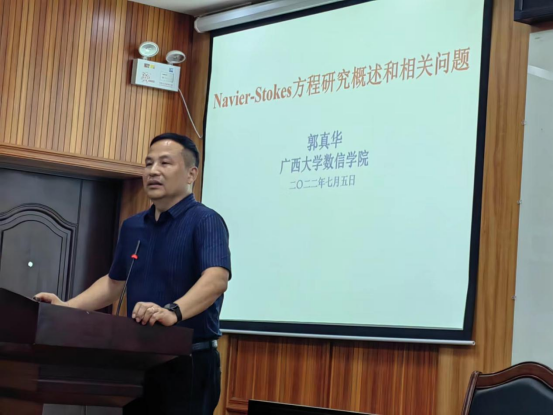 院长郭真华向参会师生作题为《Navier-Stokes方程研究概述和相关问题》的报告。郭真华院长从Navier-Stokes方程的提出开始,讲述了流体力学的数学理论给数学学科提出的挑战,介绍了宏观流体力学的核心基本问题及关于Navier-Stokes方程近年来的一些研究成果,还分享了其当前正在研究的主要应用于石油开发与运输及血液动力学的相关问题。