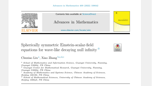 刘楚箫老师与张晓教授合作的论文“Spherically symmetric Einstein-scalar-field equations for wave-like decaying null infinity“被知名数学期刊《Advances in Mathematics》接受发表,张晓教授为该论文的通讯作者,这也是我校首次在此期刊接受发表论文。该论文研究了在零无穷远处具有波动型衰减的初值条件下的球对称爱因斯坦标量场方程的解的性质。论文证明了解的局部存在性与唯一性,小初值条件下的解的整体存在性与唯一性以及相关度量的完备性。文章的最后介绍了在这种条件下Christodoulou的广义解的定义并证明移除小初值的条件后,可以得到广义解。文章正式发表期卷号为: Advances in Mathematics,409(2022),108642。全文见。