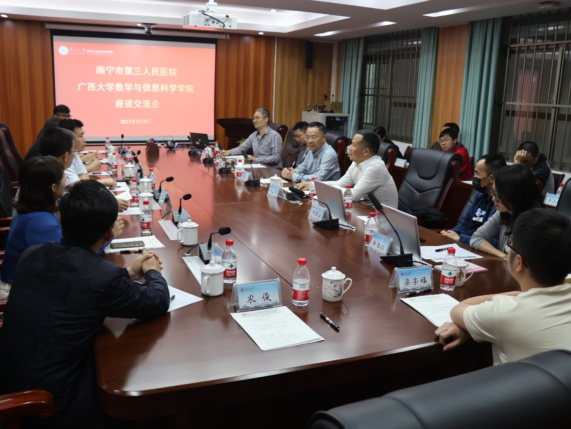 的人才团队和平台,提高医院的医疗诊治水平,为南宁第三人民医院的高质量发展注入强劲动力。郭真华院长认真听取了大家提出的问题和诉求,积极给与了回应,并根据问题当场组建了三个跨学科研究小组。他指出,数学和医学“联姻”,既要求对医学问题要有深刻的认识,又对数学学科的研究发展提出了更高的要求,用数学实现精准医疗,为医学难题提供数学方案,也是数学学科的光荣使命。南宁市三医院作为心血管专科医院,数学在血液动力学方面的应用潜力巨大、前景广阔,希望双方在进一步合作中优势互补,携手共进,促进互利共赢局面。