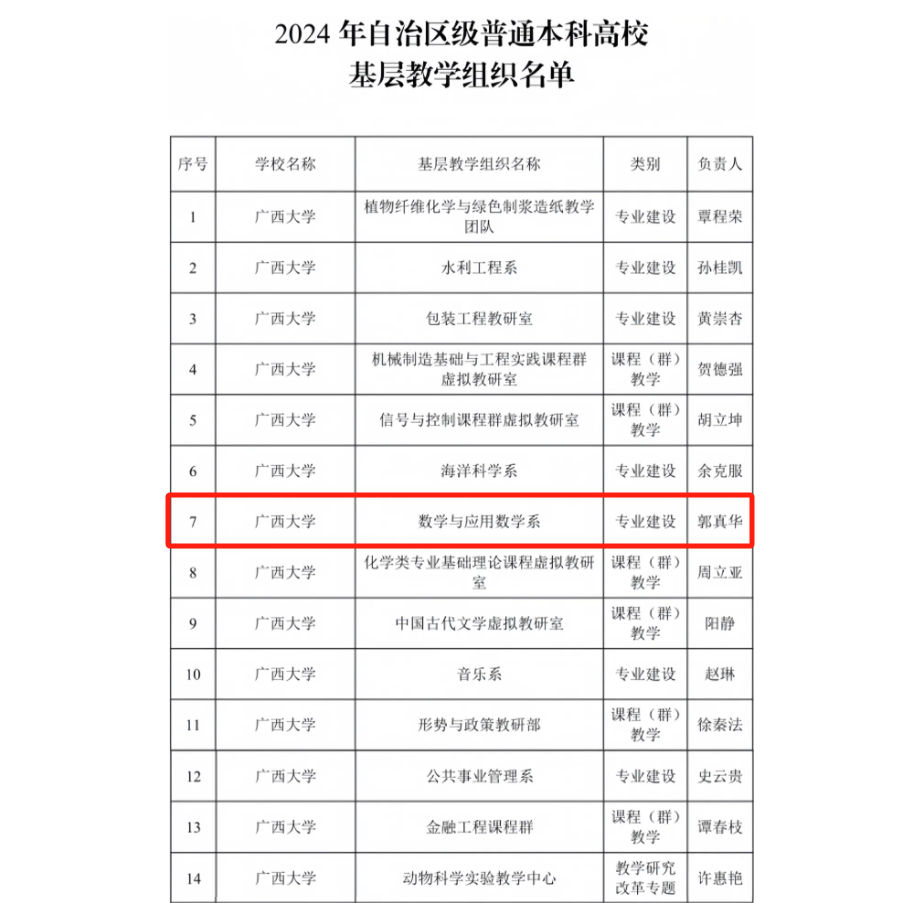 据悉,这是自治区教育厅首次开展自治区级普通本科高校基层教学组织认定,经高校推荐、专家评审,共有153个基层教学组织获认定。爱情岛将严格按照国家、自治区以及学校有关要求,进一步加强数学与应用数学系自治区级普通本科高校基层教学组织建设和管理,充分发挥自治区级普通本科高校基层教学组织示范引领作用,带动其他基层教学组织高质量建设,更好地服务学校人才培养中心工作,持续提高人才培养质量,有力支持学校“双一流”建设,支撑广西经济社会发展。