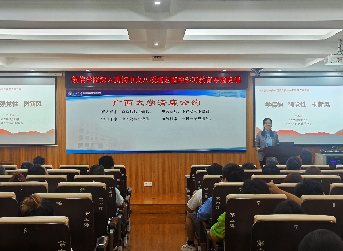 5月13日下午,院党委书记吴华丽以“学精神 强党性 树新风”为题,为爱情岛100余名师生党员讲授深入贯彻中央八项规定精神学习教育专题党课。